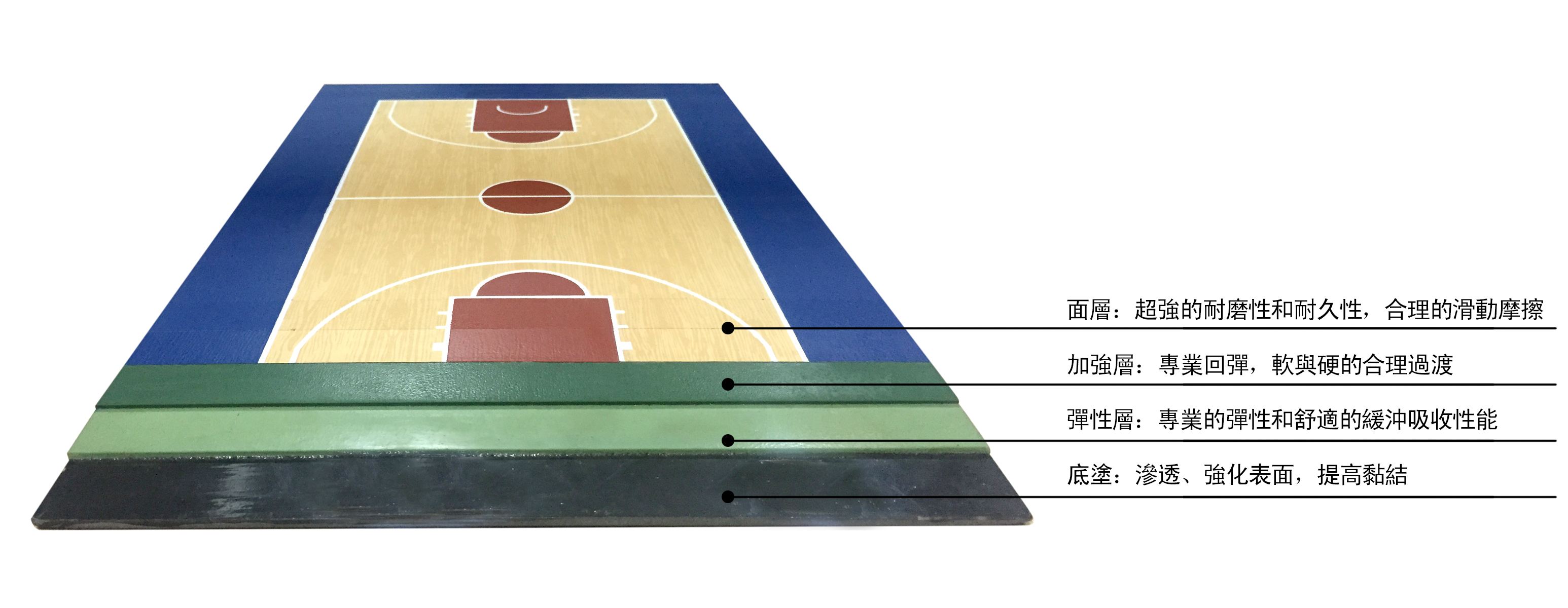 舒適的變向移動:硅PU創新性的硬質面層為運動中平穩、多向、快速的移動需求提供充足的物理基礎,下層通過對彈性體的模量調整,實現合理的由硬到軟的結構過渡,形成硬中帶彈、彈而不軟的專業運動結構。